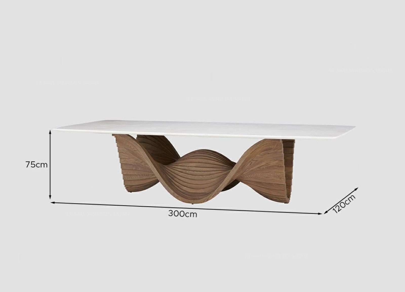 Its stunning wave-inspired wooden base showcases intricate detailing, emphasizing the natural grain of the wood while adding depth and movement to your dining room. At 300 cm × 120 cm × 75 cm (118″ × 47″ × 29″), the CANDY table offers generous space for family gatherings, special occasions, or formal dinners.