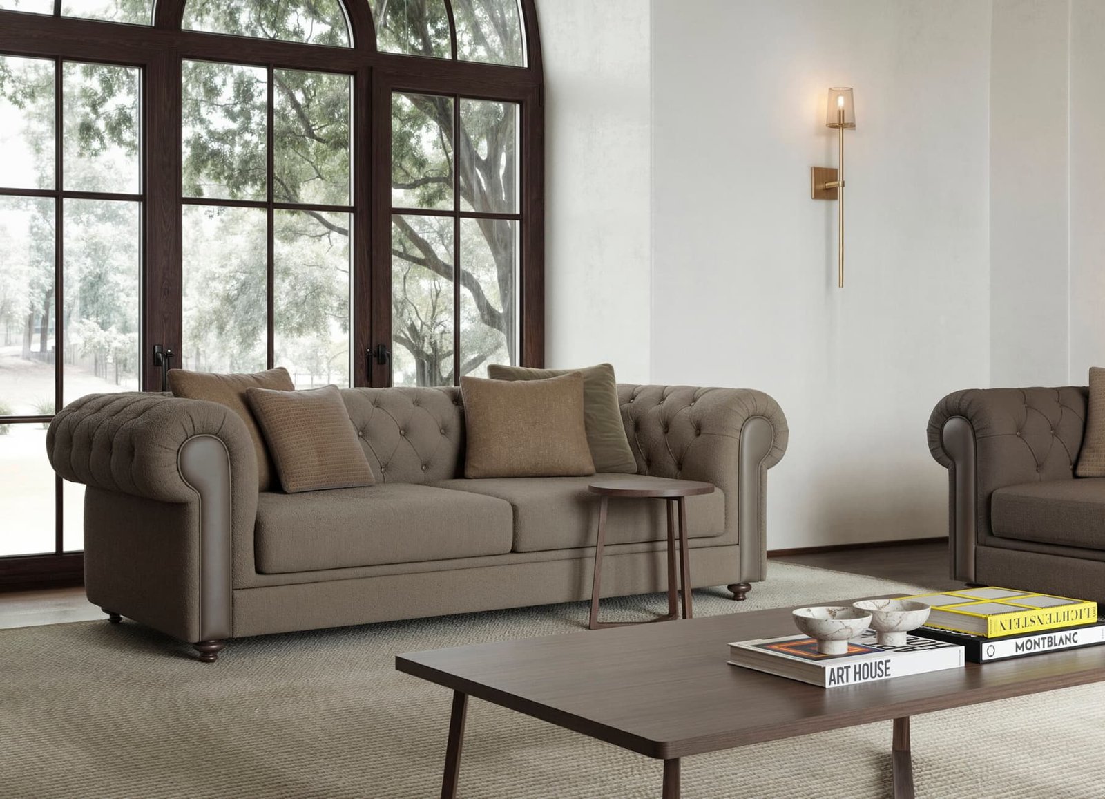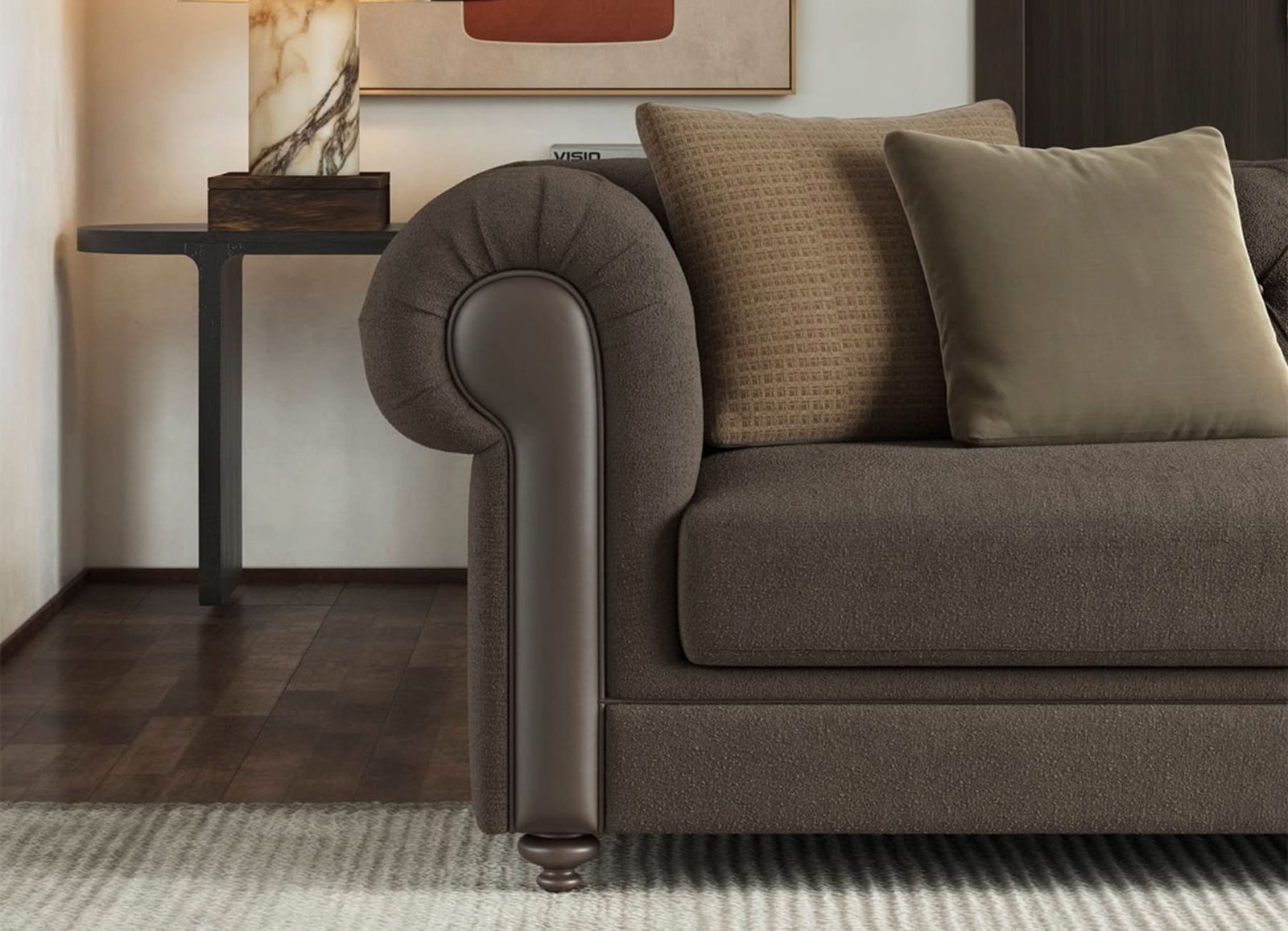 Rolled arms with leather inlays elevate the overall aesthetic