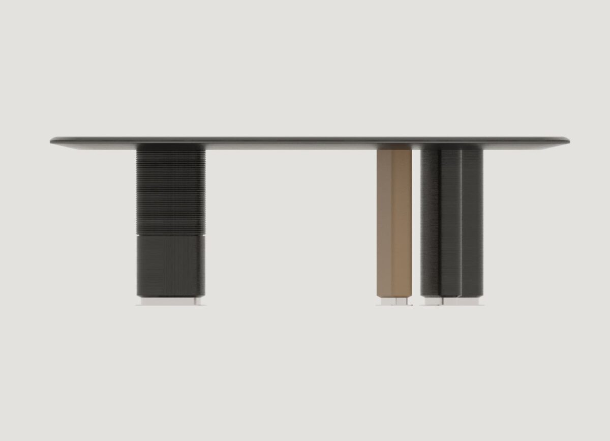 The Corte Dining Table redefines modern luxury with its bold asymmetrical base and sleek top surface. Crafted from premium solid materials, it features a unique blend of matte and gloss finishes with metallic accents that elevate any dining space. Its sculptural legs and subtle patterning create a high-design focal point. Fully customizable in size, finish, and color—ideal for luxury homes seeking tailored sophistication.