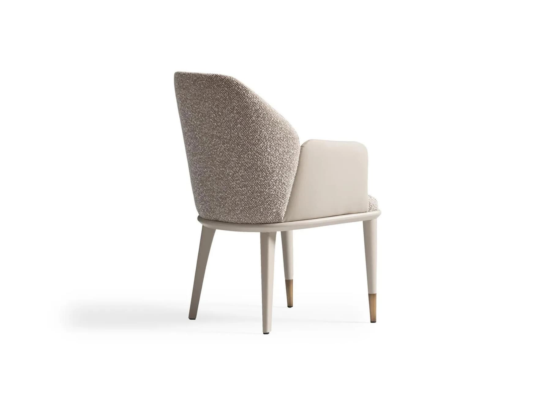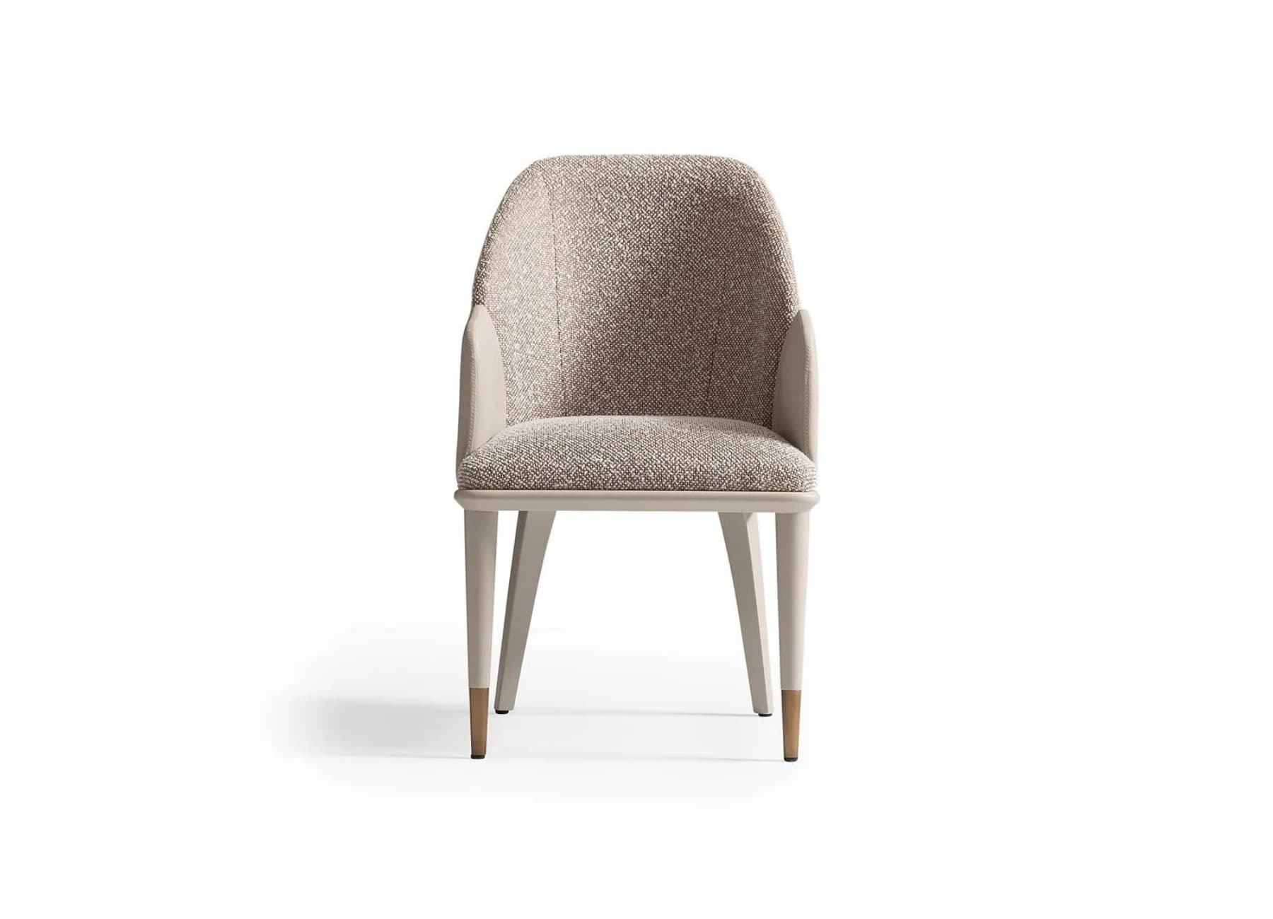 The Milano Luxury Dining Chair blends ergonomic comfort with refined elegance. Upholstered in a soft, textured beige fabric, it features gracefully curved lines and smooth armrests wrapped in taupe leatherette. The tapered legs, highlighted with subtle gold-capped tips, exude understated sophistication.