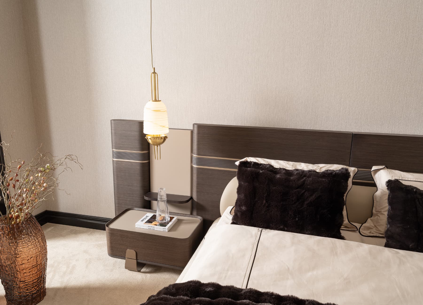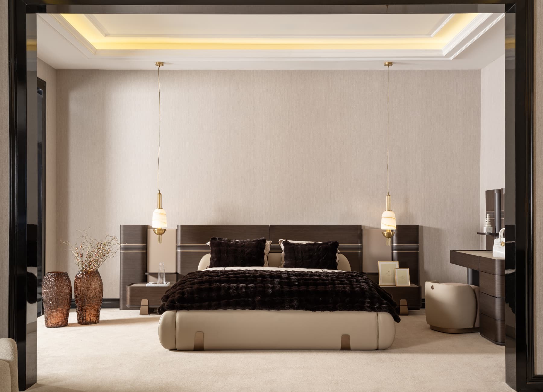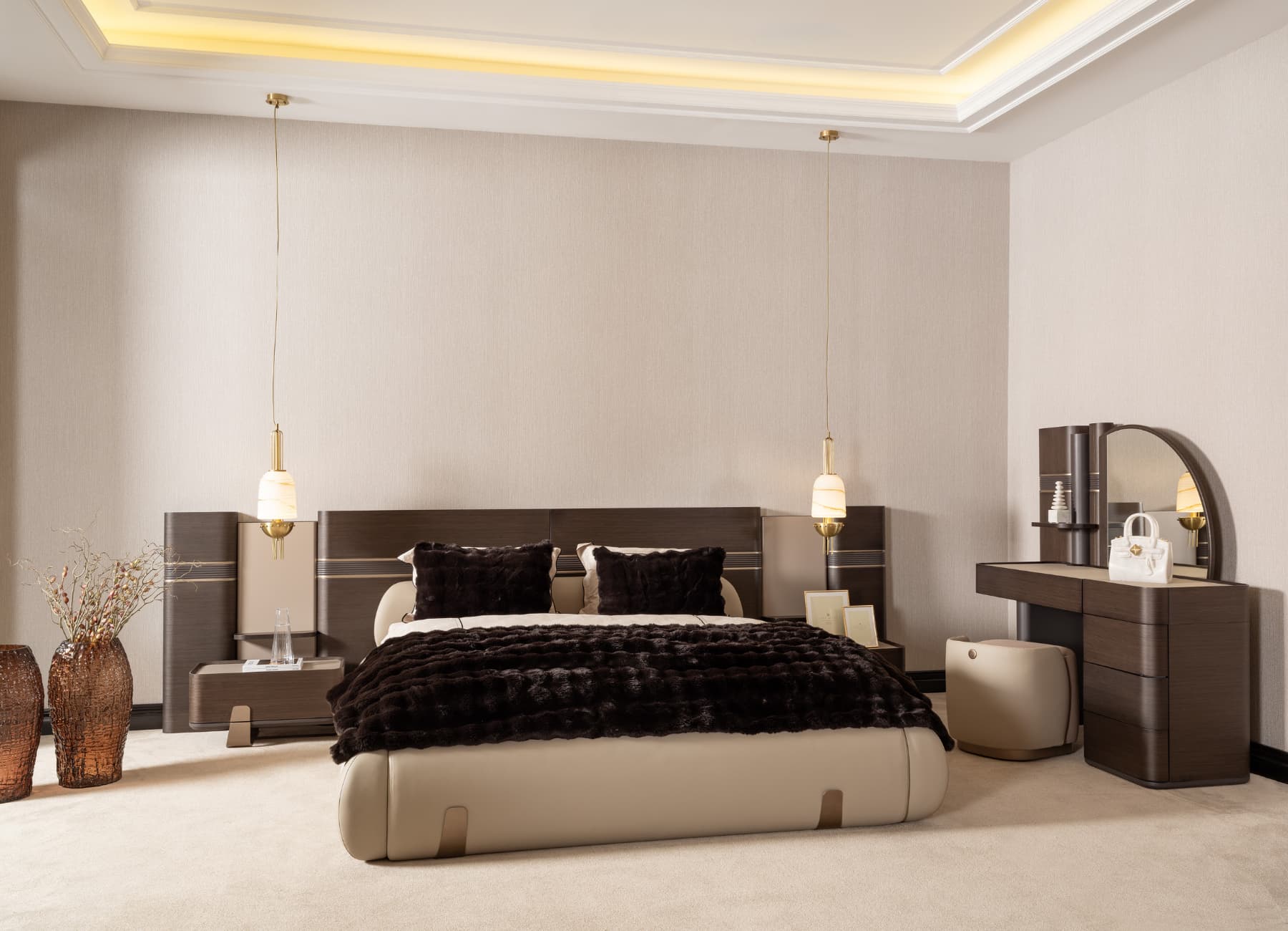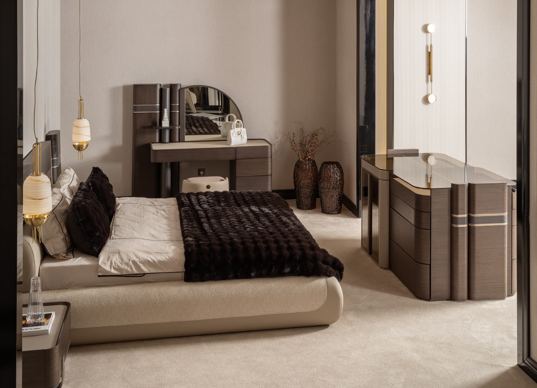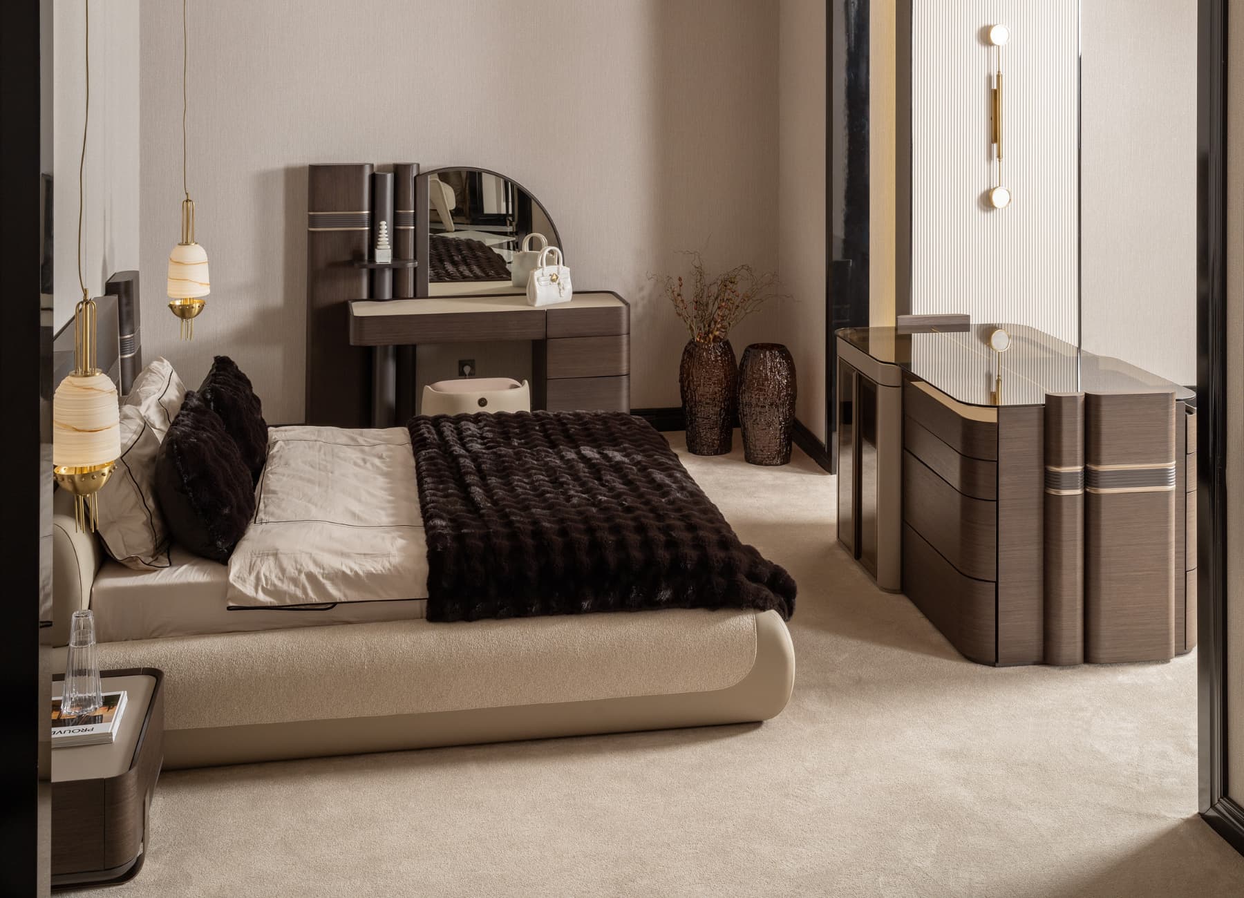 The Corte Bed transforms any bedroom into a modern sanctuary of style and comfort. With its architectural headboard design, premium dual-tone upholstery, and sculpted frame, this bed captures the essence of luxury living. The mix of warm textures and fine finishes—enhanced with signature metallic detailing—makes it the perfect centerpiece for high-end interiors. Fully customizable in color, fabric, and size to suit your space.
