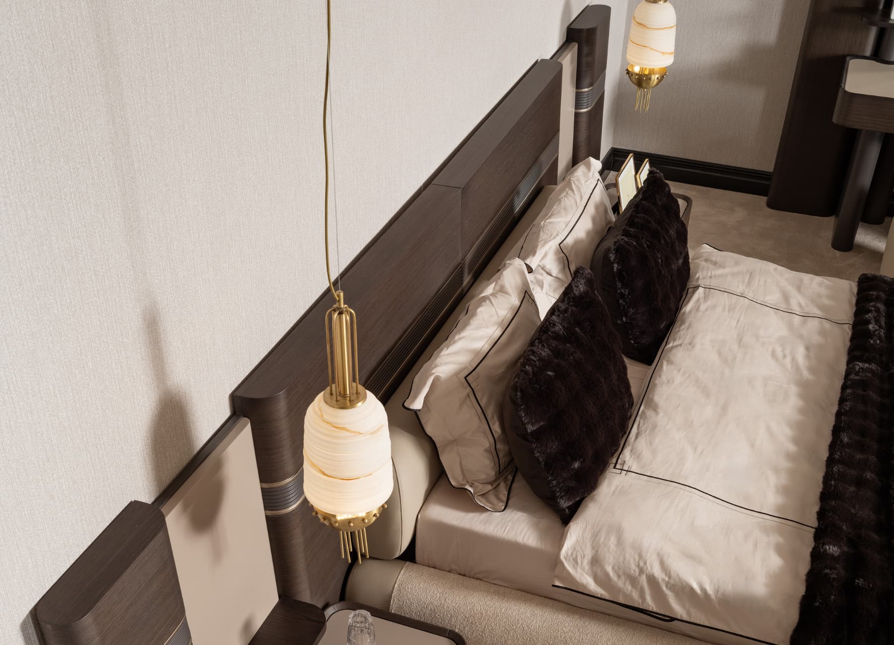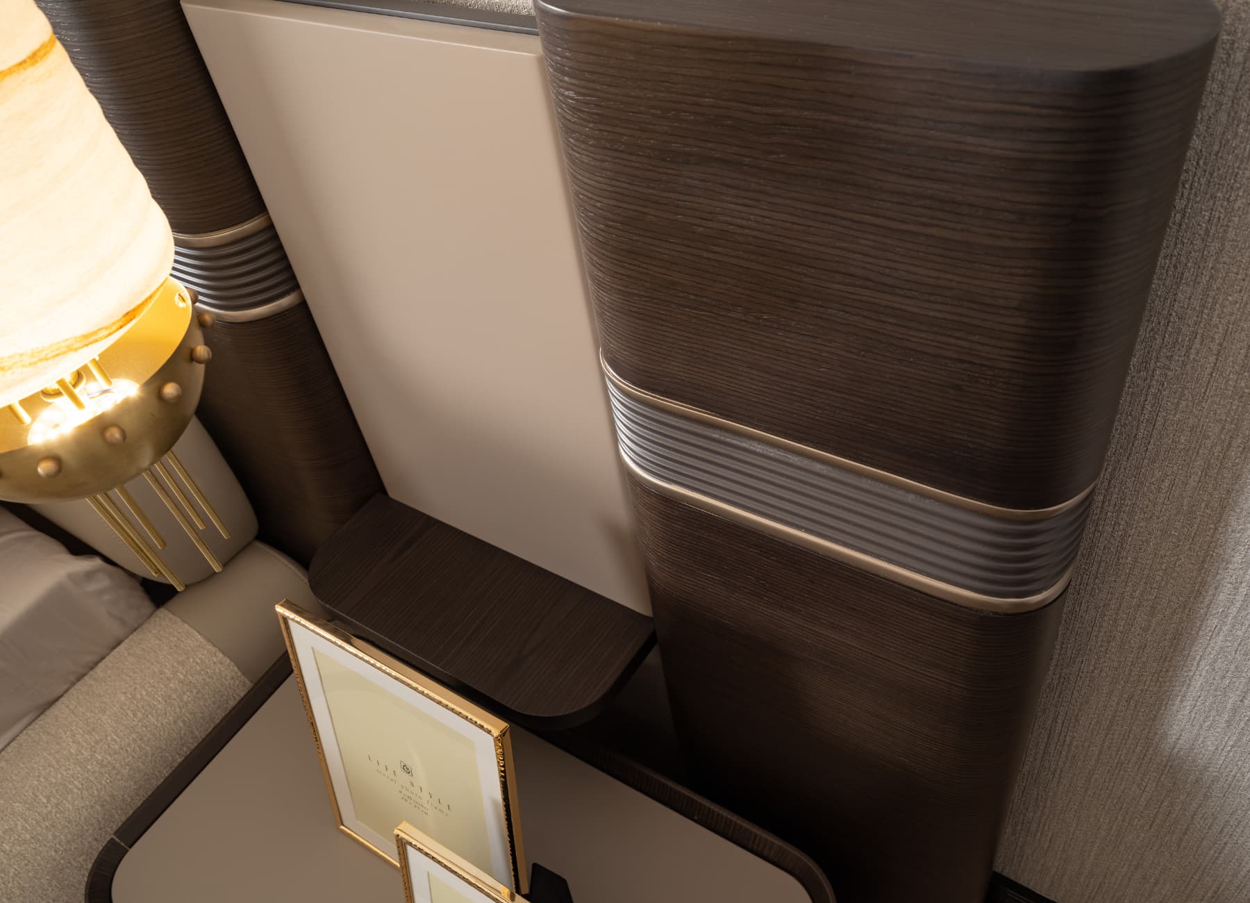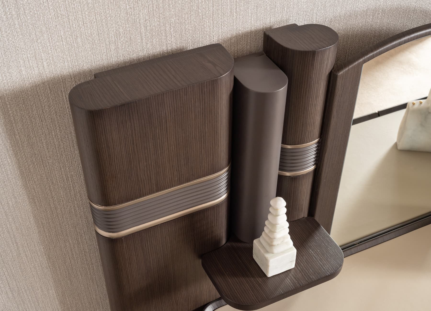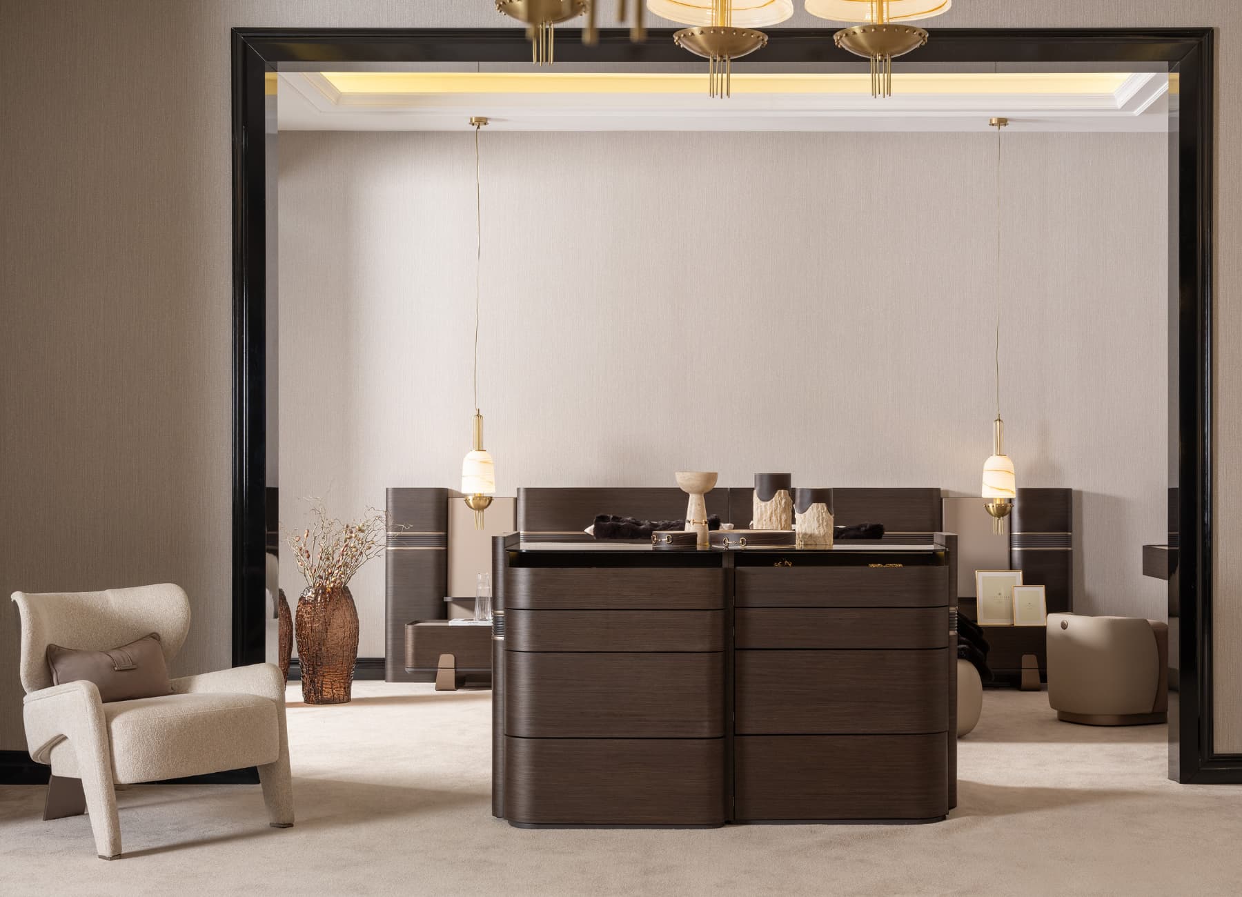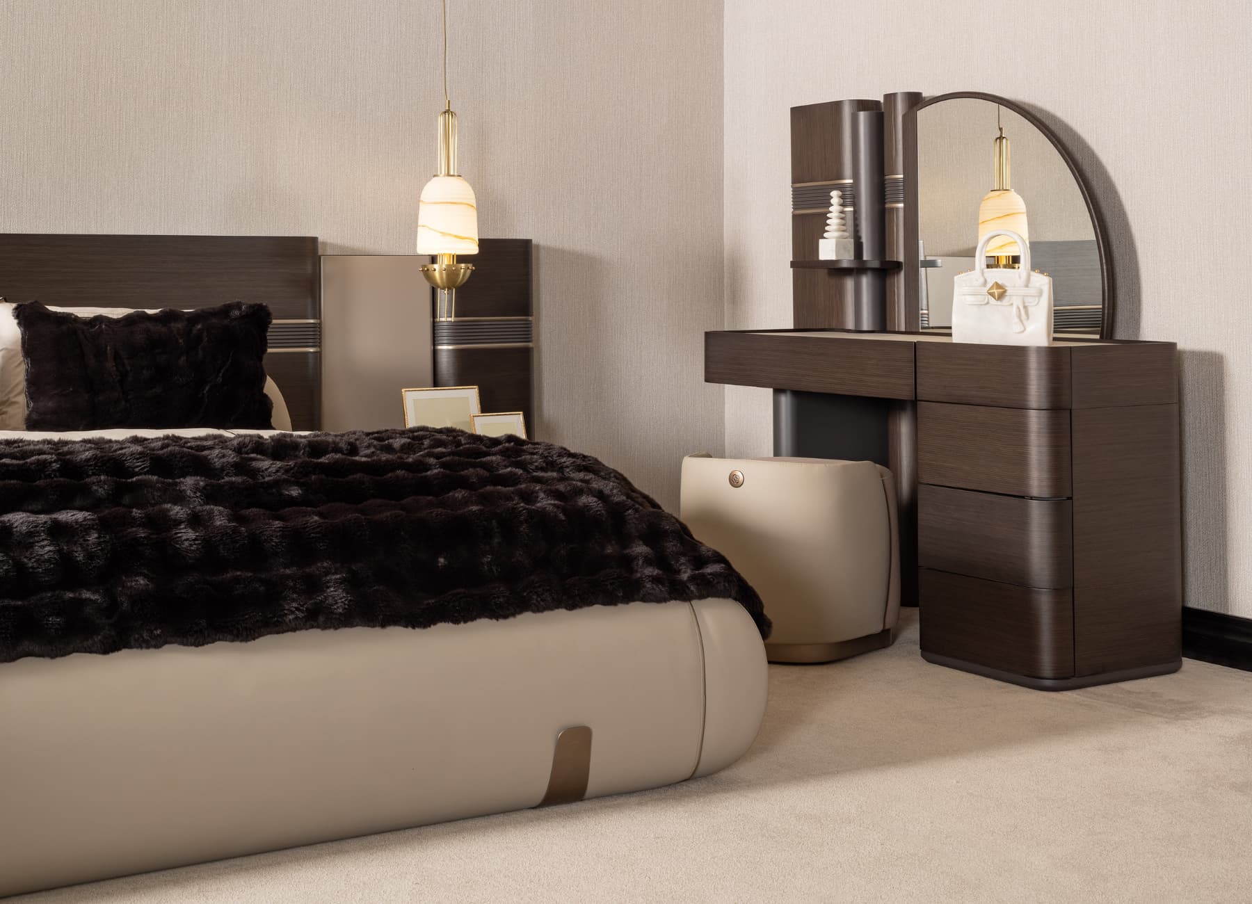 The Corte Bed transforms any bedroom into a modern sanctuary of style and comfort. With its architectural headboard design, premium dual-tone upholstery, and sculpted frame, this bed captures the essence of luxury living. The mix of warm textures and fine finishes—enhanced with signature metallic detailing—makes it the perfect centerpiece for high-end interiors. Fully customizable in color, fabric, and size to suit your space.