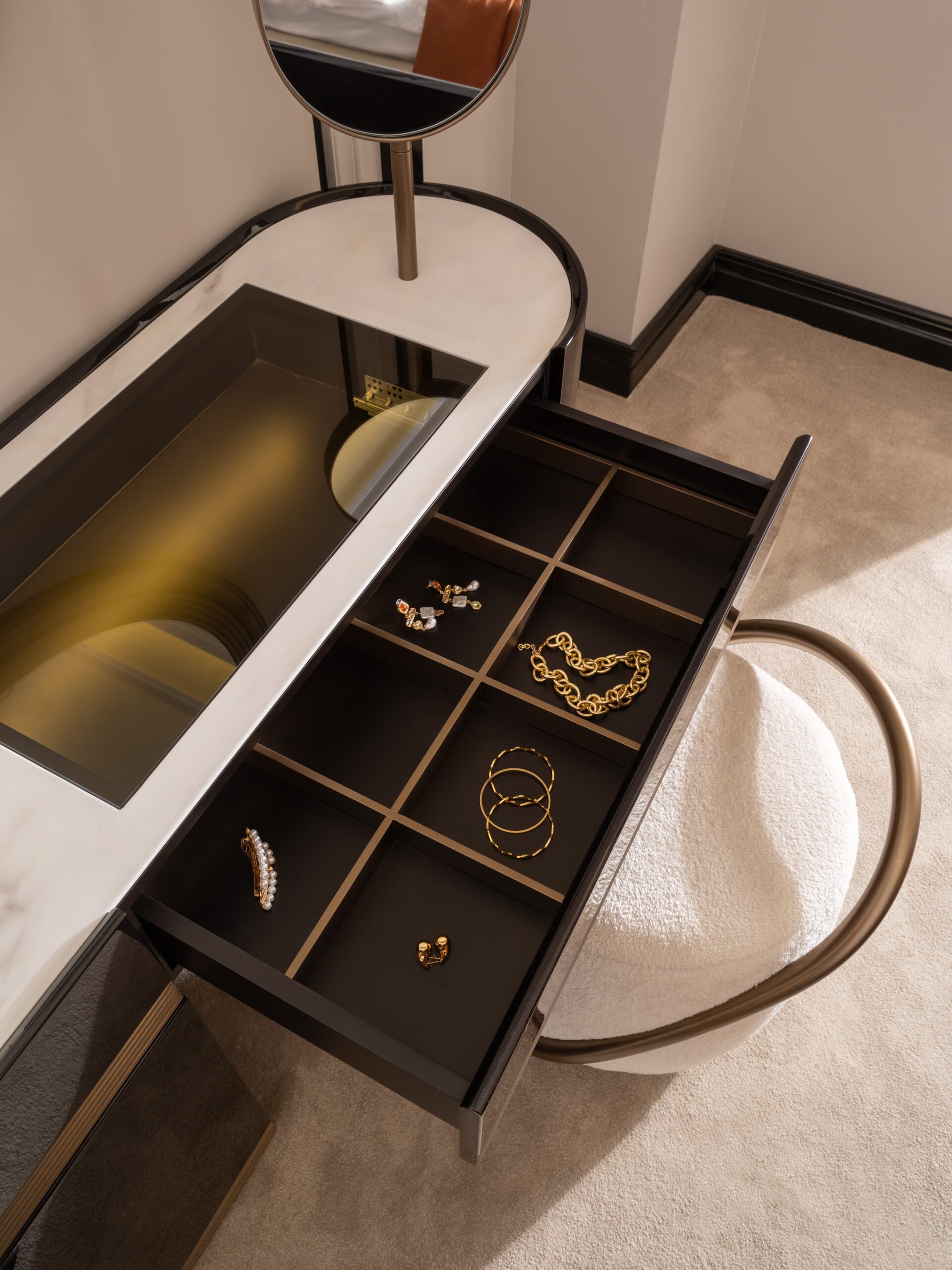 The Zenit Dresser and Mirror set is designed for elegant storage and timeless style. Featuring a sleek combination of dark high-gloss lacquer, exotic wood veneer, and gold stainless steel, the dresser is both functional and luxurious. The round mirror with a golden frame adds visual harmony and enhances the sense of space in your room. Ideal for modern interiors seeking a high-end touch.