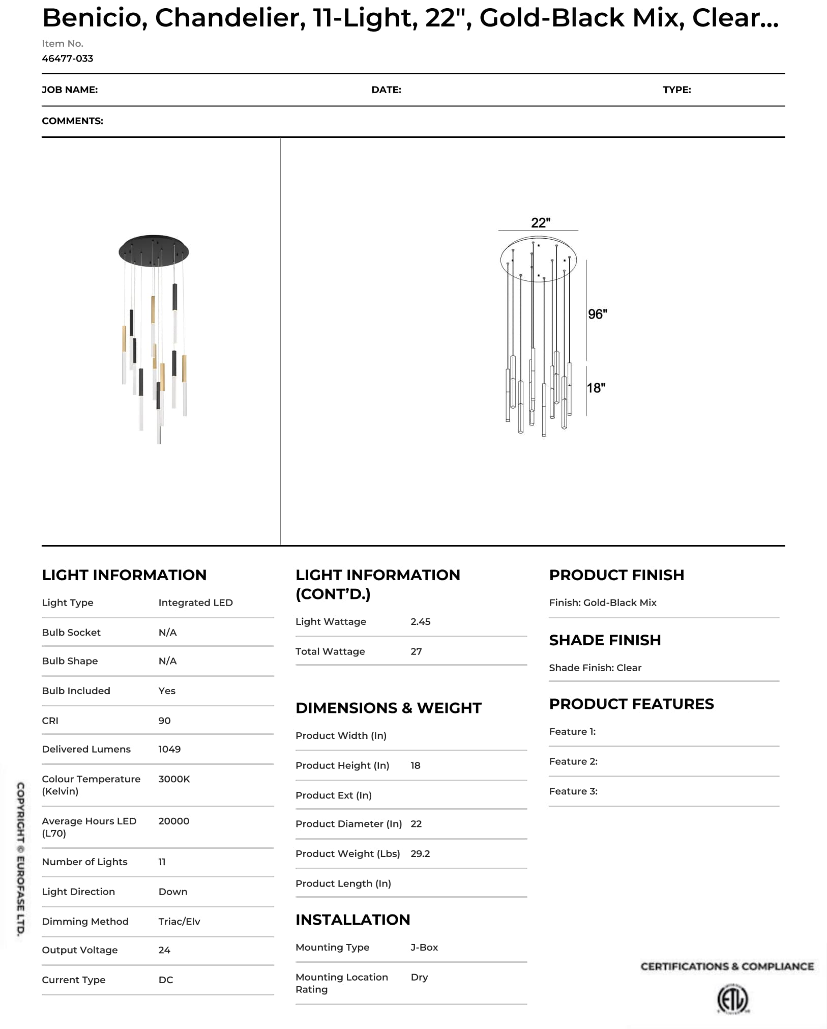 Light Source: 11 x Integrated LEDs (2.5W each | 27W total | 3000K | 1049LM | CRI 90)