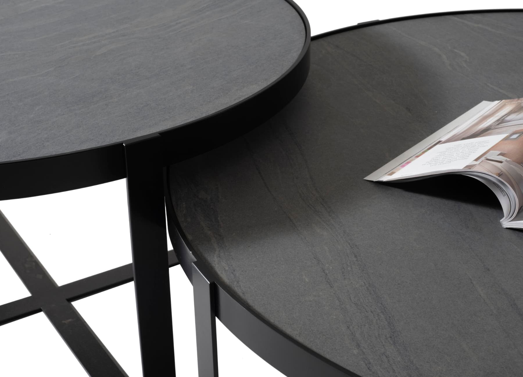 The Capella Stone Coffee Table is a premium modern nesting coffee table set that combines architectural metal design with the natural beauty of a stone-look ceramic top. Designed for contemporary and luxury interiors, this statement piece features a sleek black powder-coated metal frame (RAL 9005) paired with durable ceramic/stone-finish tops that replicate the elegance of natural marble and stone while offering superior resistance to scratches, heat, and stains.