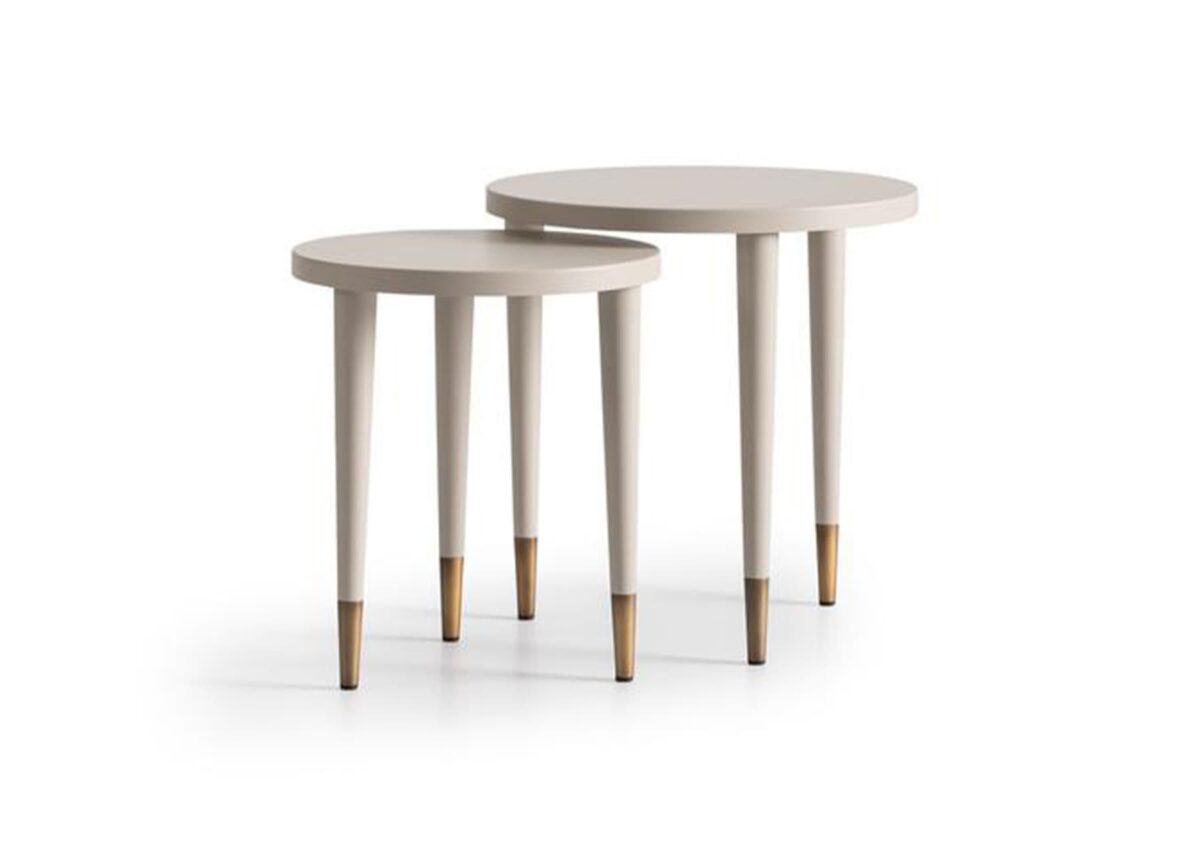 The Casto Nesting Table set blends clean design with space-saving convenience. Featuring two sleek round tables in a warm matte finish with tapered legs and golden tips, this duo offers versatile elegance for modern interiors.